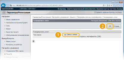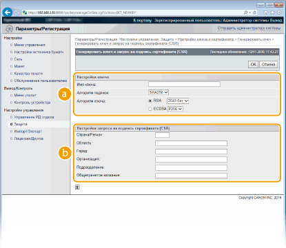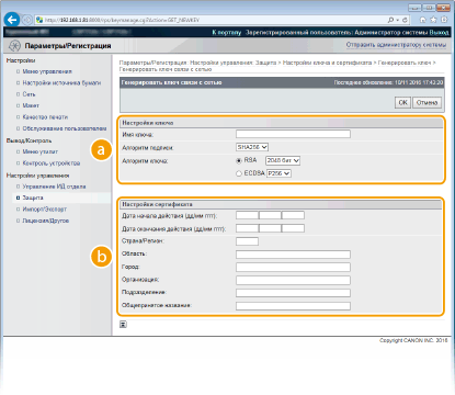 Для обмена зашифрованными данными по протоколу TLS (Transport Layer Security, безопасность транспортного уровня) можно сгенерировать пару ключей для аппарата. При обращении к аппарату посредством Удаленного ИП или при печати IPP можно использовать протокол TLS. Для аппарата можно зарегистрировать до восьми пар ключей, включая предустановленные пары. Самозаверенные сертификаты используются с парами ключей, сгенерированными в разделе "Связь с сетью". Посредством "Ключ и запрос на подпись сертификата (CSR)" можно запросить в центре сертификации (CA) цифровой сертификат для сгенерированной аппаратом пары ключей.