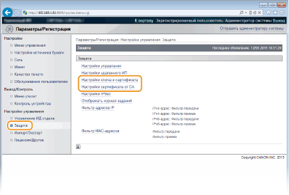 Щелкните [Защита]  [Настройки ключа и сертификата] или [Настройки сертификата от CA].