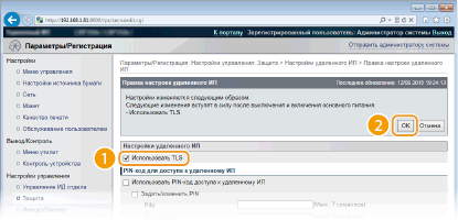 3 | Установите флажок [Использовать TLS] и щелкните [OK]. [Использовать TLS] При использовании протокола TLS для связи с Удаленным ИП установите этот флажок. Если этот протокол не используется, снимите флажок. |