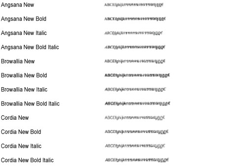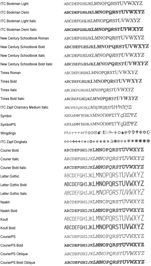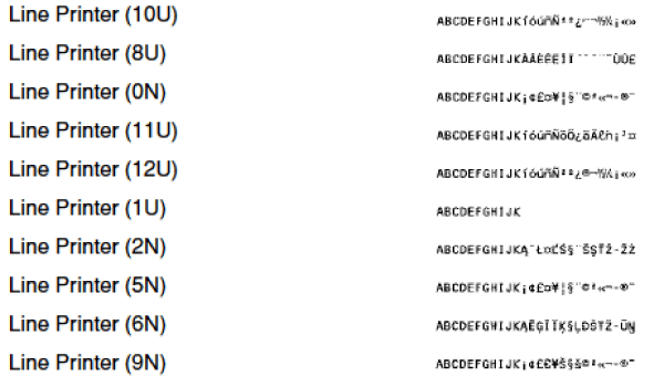 Fontu saraksti, kas izdrukāti no izvēlnes Utility (Utilītprogrammas), ir pilnīgs visu pašreiz pieejamo fontu saraksts. Sarakstos ir ietverti printerī saglabāto fontu nosaukumi un drukas piemēri.