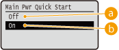 Ja lietojat tīkluJa kāds no zemāk norādītajiem iestatījumiem ir <On>, ātrās startēšanas funkcija ir atspējota.