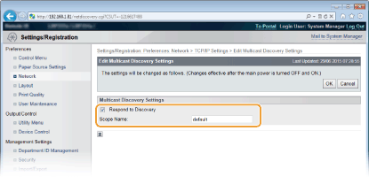 Atzīmējiet šo izvēles rūtiņu, lai iestatītu iekārtu atbildēt uz ierīču pārvaldības programmatūras multiraides atklāšanas paketēm un iespējotu ierīču pārvaldības programmatūras veiktu pārraudzību. Ja nevēlaties iestatīt, lai iekārta reaģē, notīriet šo izvēles rūtiņu. [Scope Name]