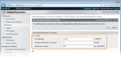 Atzīmējiet šo izvēles rūtiņu, lai informētu ierīču pārvaldības programmatūru par iekārtas enerģijas statusu. Ja ir atzīmēta izvēles rūtiņa [Notify], iekārta neveiks nevajadzīgu saziņu miega režīmā un samazinās kopējo enerģijas patēriņu. [Port Number]