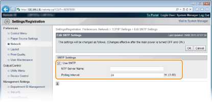 Sakaru ar NTP/SNTP serveri pārbaudeVarat skatīt statusu sakariem ar reģistrēto serveri, noklikšķinot uz [Settings/Registration]