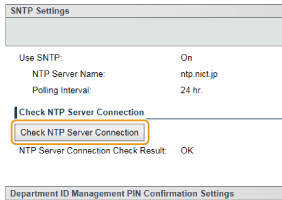 [Network] [TCP/IP Settings] un pēc tam parādītajā sadaļā [SNTP Settings] noklikšķinot uz [Check NTP Server Connection]. Ja ir pareizi izveidots savienojums, tiek parādīts attēlā tālāk redzamais rezultāts. Ņemiet vērā, ka šīs darbības laikā sistēmas pulkstenis netiek pielāgots.