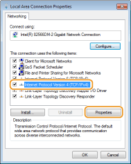 Atzīmējiet izvēles rūtiņu [Iespējot interneta protokola 4. versiju (IPv4)] vai [Interneta protokols] un noklikšķiniet uz [Rekvizīti].