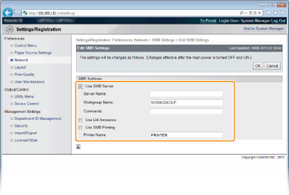 Ja iekārtā izmantojat SMB drukāšanas funkciju, atzīmējiet šo izvēles rūtiņu.