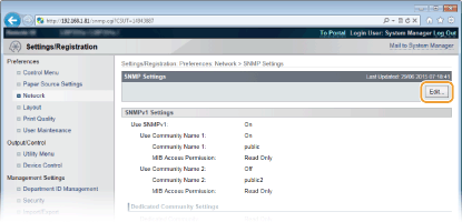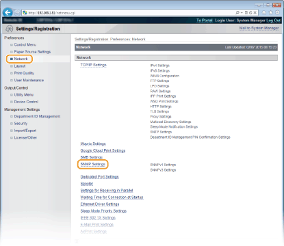 Vienkāršais tīkla pārvaldības protokols (Simple Network Management Protocol, SNMP) ir protokols sakaru ierīču uzraudzībai un vadībai tīklā, izmantojot pārvaldības informācijas bāzi (Management Information Base, MIB). Iekārta atbalsta SNMPv1 un paaugstinātas drošības SNMPv3. Iekārtas statusu datorā varat pārbaudīt, kad drukājat dokumentus vai izmantojat utilītprogrammu Remote UI (Attālais interfeiss). Ir iespējams iespējot SNMPv1 vai SNMPv3 vai arī abas iespējas vienlaikus. Norādiet katras versijas iestatījumus atbilstoši tīkla videi un lietošanas mērķim.