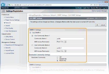 Ļauj skatīt un mainīt MIB objektu vērtības, izmantojot atvēlētās kopienas funkciju (Dedicated Community).