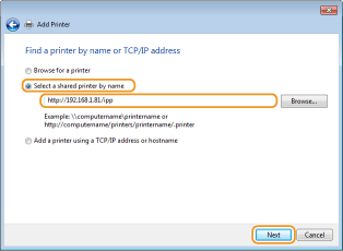 Izvēlieties [Atlasīt koplietotu printeri pēc nosaukuma], ievadiet savienojuma adresātu un noklikšķiniet uz [Tālāk].