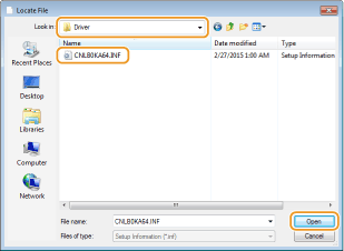 Norādiet mapi, kurā ir printera draiveri, izvēlieties INF failu un tad noklikšķiniet uz [Atvērt].