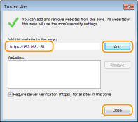 Pārbaudiet, vai ir redzams “https://<Iekārtas IP adrese> vai <iekārtas resursdatora nosaukums>.<domēna nosaukums>/”, un pēc tam noklikšķiniet uz [Pievienot]