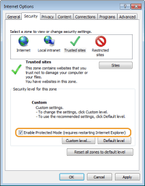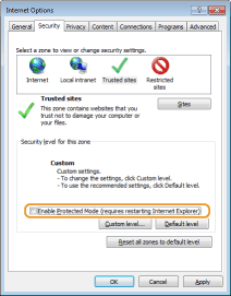 Ja ir atzīmēta izvēles rūtiņa [Iespējot aizsargrežīmu (jārestartē programma Internet Explorer)], notīriet to.