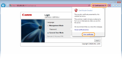 Adreses lauka labajā pusē noklikšķiniet uz [Sertifikāta kļūda]