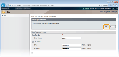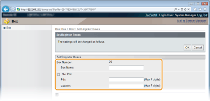 Lai iestatītu PIN kodu, atzīmējiet izvēles rūtiņu [Set PIN] un tekstlodziņā [PIN] ievadiet PIN skaitli. Lai apstiprinātu, ievadiet to pašu skaitli tekstlodziņā [Confirm].