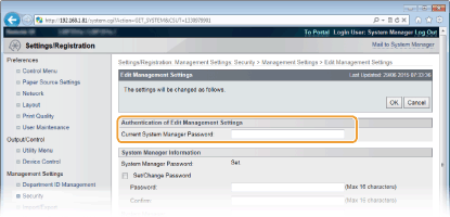 Ievadiet sistēmas pārvaldnieka paroli sadaļā [Current System Manager Password].