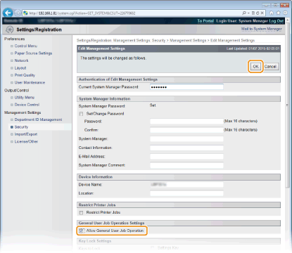 Atzīmējiet izvēles rūtiņu [Allow General User Job Operation] un noklikšķiniet uz [OK].