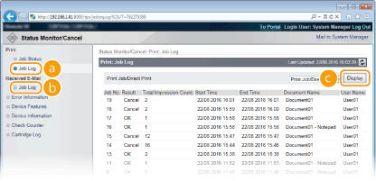 Apturētajiem dokumentiem un aizsargātajiem dokumentiem noklikšķiniet uz [Job No.], lai parādītu detalizētu informāciju. Var pārbaudīt izdrukātā dokumenta lietotājvārdu un lapu skaitu.