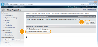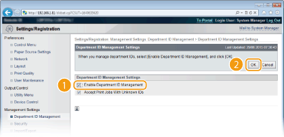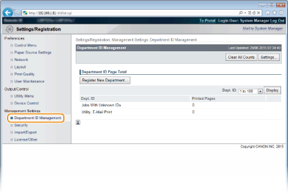 Sadaļā [User Management] izvēlieties iespēju [Department ID Management] un tad zemāk noklikšķiniet uz [Settings].