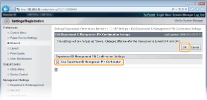 Atzīmējiet izvēles rūtiņu [Use Department ID Management PIN Confirmation]