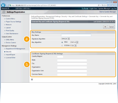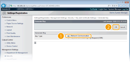 Iekārtā var ģenerēt atslēgu pāri, ja tas ir nepieciešams šifrētiem sakariem, izmantojot transporta slāņa drošību (TLS). TLS varat izmantot, ja iekārtai piekļūstat, izmantojot Remote UI (Attālais interfeiss) vai veicot IPP drukāšanu. Ir iespējams reģistrēt līdz astoņiem atslēgu pāriem, iekļaujot iepriekš instalētos pārus. Pašparakstīti sertifikāti tiek izmantoti ar atslēgu pāriem, kas ģenerēti sadaļā “Network Communication” (Tīkla saziņa). Izmantojot iespēju “Key and Certificate Signing Request (CSR)” (Atslēgu un sertifikātu parakstīšanas pieprasījums (CSR)), varat pieteikties CA izsniegtam digitālam sertifikātam iekārtas ģenerētam atslēgu pārim.
