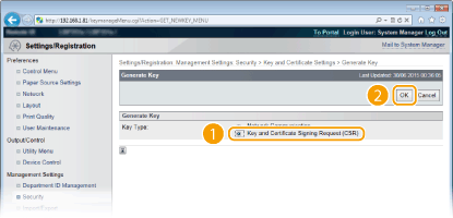 Izvēlieties [Key and Certificate Signing Request (CSR)] un noklikšķiniet uz [OK].