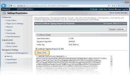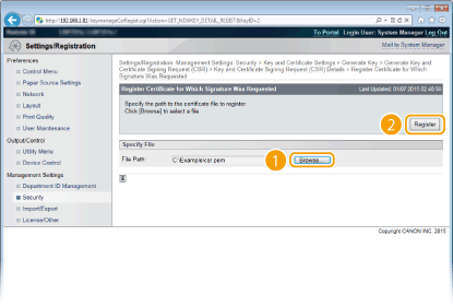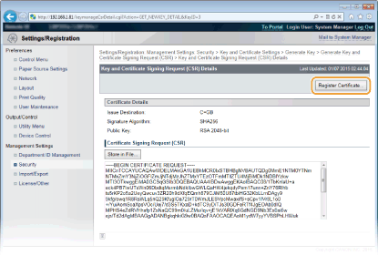 Ar sertifikāta parakstīšanās pieprasījumu (CSR) ģenerēto atslēgu pāri varat izmantot tikai pēc tam, kad sertifikāts ir reģistrēts. Kad sertificēšanas iestāde ir izsniegusi digitālo sertifikātu, reģistrējiet to, izmantojot tālāk aprakstīto procedūru.