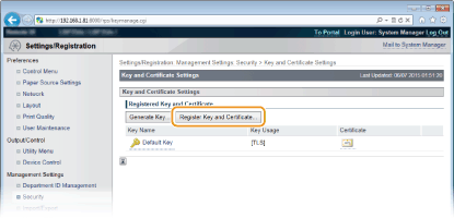 Noklikšķiniet uz [Register Key and Certificate] vai [Register CA Certificate].