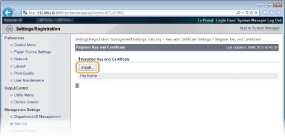 Noklikšķiniet uz [Key and Certificate Settings], lai instalētu atslēgu pāri, vai uz [CA Certificate Settings], lai instalētu CA sertifikātu.