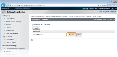 Noklikšķiniet uz [Register], kas atrodas pa labi no CA sertifikāta, ko vēlaties reģistrēt.