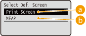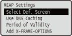 MEAP galvenā ekrāna iestatījumu vienumi tiek uzskaitīti ar īsiem aprakstiem. Noklusējuma iestatījumi ir atzīmēti ar krustiņu (