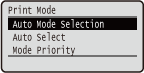 Iekārta pārslēdzas automātiskās izvēles režīmā, ja iespējas <Auto Mode Selection> iestatījums ir <Auto Selection>. Iekārta automātiski atšķir no datora sūtītos datus un izvēlas drukāšanas režīmu. Drukājot no lietojumprogrammas, galvenokārt izmantojiet šo drukāšanas režīmu.