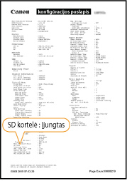 Atspausdinkite Konfigūracijos puslapis, SD kortelė įdėta tinkamai, jei valymo meniu esantis laukas „SD kortelė“ yra „Įjungta“.