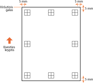 . Remdamiesi šiomis žymėmis nustatykite koreguojamą kryptį ir atstumą. Kai spausdinimo padėtis yra tinkama, visos žymės atspausdinamos 5 mm nuo artimiausio popieriaus krašto.