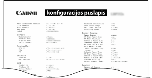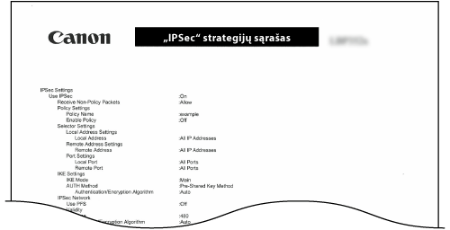 Network). Informacija apie saugą, įskaitant adresų filtravimo nuostatas ir „IPSec“ parametrus taip pat atspausdinama.