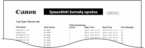 Galite atspausdinti aparato SD kortelėje laikomų dokumentų spausdinimo žurnalą sąrašo forma.