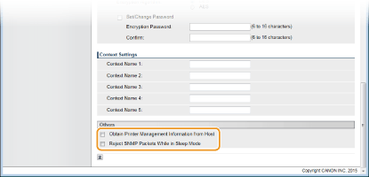 Jei pažymėsite žymės langelį, SNMP protokolą naudojančioms programoms, pvz., „Canon“ programinei įrangai „imageWARE Series“, gali būti neleidžiama prisijungti prie aparato.