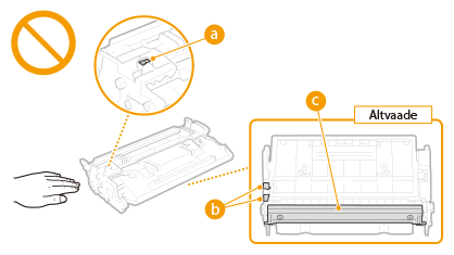Toonerikasseti käsitsemineVeenduge, et hoiate toonerikassetti selle käepidemest. ![]() Ärge puudutage toonerikasseti mälu- ( ) ega elektrikontakte ( ). Et vältida seadme sisemuses oleva trumli pinna kriimustamist ja kaitsta seda valguse eest, ärge avage trumlit kaitsvat luuki ( ).![]() Välja arvatud juhul, kui see on hädavajalik, ärge võtke toonerikassetti pakkematerjalist või seadmest välja. Toonerikassett on magnetiline. Ärge asetage seda magnetismi suhtes tundlike esemete (nt disketid ja kettaseadmed) lähedusse. See võib andmeid kahjustada. Toonerikasseti säilitamineSäilitage toonerikassetti turvalise ja korraliku kasutuse tagamiseks järgmises keskkonnas. Temperatuurivahemik säilitamisel: 0 °C kuni 35 °C Õhuniiskuse vahemik säilitamisel: 35–85% RH (suhteline õhuniiskus / kondensaadita)* Ärge võtke toonerikassetti kaitsekotist välja enne, kui soovite seda kasutada. Kui eemaldate säilitamise eesmärgil toonerikasseti seadmest, asetage see algupärasesse pakkematerjali. Ärge asetage toonerikassetti säilitamiseks püsti või tagurpidi asendisse. Tooner moodustab kassetis ühtlase klombi ja võib juhtuda, et selle algset seisukorda ei saa taastada isegi kasseti raputamisel. * Isegi säilitamiseks sobivas niiskusvahemikus võivad toonerikasseti sise- ja välisküljele tekkida veepiisad, kui sise- ja välisküljel on erinev temperatuur. Kondensaat mõjutab ebasoodsalt toonerikassettide prindikvaliteeti. Ärge säilitage toonerikassetti järgmistes kohtadesLahtise leegi läheduses Otsese päikesevalguse või heleda valguse käes kauem kui viis minutit Väga soolase õhu käes Kohas, kuhu pääsevad söövitavad gaasid (nt aerosoolid ja ammoniaak) Kohas, kus on kõrge temperatuur ja suur õhuniiskus Kohas, kus on suured temperatuurikõikumised ja muutused niiskusetasemes, mis võivad kergesti tekitada kondensaati Kohas, kus on väga tolmune Kohas, kuhu lapsed juurde pääsevad Hoiduge võltsitud toonerikassettide kasutamisestArvestage, et turul võidakse müüa järeletehtud Canoni toonerikassette. Mitteoriginaal-toonerikassetid võivad põhjustada seadme halba printimiskvaliteeti või sooritusvõimet. Canon ei vastuta rikete, õnnetuste või kahjustuste eest, mis on põhjustatud mitteoriginaal-toonerikassettide kasutamisest. Lisateavet leiate veebilehelt global.canon/ctc. Varuosade, toonerikassettide jms saadavusaegSelle seadme varuosad, toonerikassetid jms on saadaval vähemalt seitse (7) aastat pärast selle seadmemudeli tootmise lõpetamist. Toonerikasseti pakkematerjalidHoidke toonerikasseti pakkematerjalid alles. Neid on vaja seadme transportimisel. Pakkematerjalide vormi või asukohta võidakse muuta või neid võidakse lisada ilma eelneva hoiatuseta. Pärast toonerikasseti sulgurlindi välja tõmbamist kõrvaldage see kasutuselt vastavalt kohalikele eeskirjadele. Kasutatud toonerikasseti jms kõrvaldamineToonerikasseti jms kasutuselt kõrvaldamisel asetage see algupärasesse pakkematerjali, et vältida tooneri kasseti sees laiali paiskumist, ja kõrvaldage kasutuselt vastavalt kohalikele eeskirjadele. |