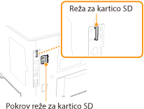 V tem poglavju je opisan postopek namestitve in inicializacije kartice SD. Vstavite kartico SD v režo za kartico SD na zadnji strani naprave. Preden vstavite kartico SD, v priročniku Namestitev preberite poglavje o previdnostnih ukrepih. Ne spreglejte, da se podatki v napravi, ki se shranjujejo na kartico SD, lahko šifrirajo. Na ta način je zagotovljena varna uporaba kartice SD v računalniku ali v drugi situaciji, saj so šifrirani podatki na kartici SD zaščiteni pred nepooblaščeno ekstrakcijo.