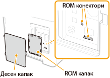 Този раздел описва как да инсталирате Barcode Printing Kit или PCL International Font Set в устройството. ROM се използва свързан към ROM конекторите в десния капак на устройството. Прочетете предпазните мерки в Инсталиране, преди да инсталирате ROM. | ![]() |