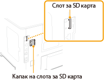 Този раздел описва как да поставите и инициализирате SD карта. Поставете SD картата в слота за SD карта, намиращ се на гърба на устройството. Прочетете предпазните мерки в раздела Инсталиране, преди да инсталирате SD картата. Имайте предвид, че данните в устройството, които се съхраняват на SD картата, се подлагат на шифроване. Това осигурява безопасно използване на SD картата на компютър или в друга ситуация, защото шифрованите данни в SD картата са защитени срещу неупълномощено извличане. | ![]() |
