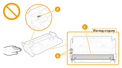 Работа с касетата с тонерХващайте тонер касетата за дръжката. ![]() Не докосвайте паметта на тонер касетата ( ) или електрическите контакти ( ). За да избегнете надраскването на повърхността на барабана в устройството или излагането му на светлина, не отваряйте защитния затвор на барабана ( ).![]() Не изваждайте тонер касетата от опаковката или устройството, освен когато е необходимо. Тонер касетата е магнитен продукт. Не я поставяйте близо до продукти, които са чувствителни на магнитно поле, включително дискети и дискови устройства. В противен случай данните в тях може да се повредят. Съхранение на тонер касетатаЗа да гарантирате безопасна и удовлетворителна работа на тонер касетата, съхранявайте я при следните условия. Диапазон на температурата на съхранение: 0 °C до 35 °C Диапазон на влажността на съхранение: 35 % до 85 % RH (относителна влажност, без конденз)* Съхранявайте касетите неотворени, докато не ви потрябват. Когато извадите тонер касетата от устройството с цел съхранение, сложете я в оригиналната опаковка. Не съхранявайте тонер касетата в изправено положение или с дъното нагоре. Тонерът може да се втвърди и да не успеете да възстановите неговото прахообразно състояние дори и чрез разклащане. * Дори в подходящия за съхранение диапазон на влажност, в тонер касетата може да се образуват водни капки (конденз), ако има разлика във вътрешната и външната температура на тонер касетата. Кондензът влияе негативно на качеството на печат на тонер касетите. Не съхранявайте тонер касетите на местата по-долуМеста в близост до открит огън Места, изложени на пряка слънчева светлина или ярка светлина за повече от пет минути Места с изключително солен въздух Места с корозивни газове (напр. аерозолни спрейове и амоняк) Места с висока температура и висока влажност Места с резки промени в температурата и влажността, което лесно може да предизвика конденз Силно запрашени места Места, достъпни за деца Бъдете внимателни за неоригинални тонер касетиМоля, имайте предвид, че на пазара се продават неоригинални тонер касети, имитиращи тези на Canon. Използването на неоригинална тонер касета може да доведе до влошено качество на отпечатване и до понижаване на производителността на машината. Canon не носи отговорност за неизправности, злополуки или повреди, предизвикани от използването на неоригинална тонер касета. За повече информация вижте global.canon/ctc. Период на наличност на резервните части, тонер касети и подобниРезервни части, тонер касети и подобни за устройството ще бъдат налични за поне седем (7) години след прекратяване на производството на модела. Опаковъчни материали на тонер касетатаПазете опаковъчните материали на тонер касетата. Може да са ви необходими, когато транспортирате устройството. Опаковъчните материали може да се различават по форма или място на поставяне, както е възможно и да бъдат добавяни или отстранявани без предупреждение. След като издърпате запечатващата лента от тонер касетата, трябва да я изхвърлите в съответствие с приложимите местни разпоредби. При изхвърляне на употребените тонер касети и подобниКогато изхвърляте тонер касета, поставете я в оригиналната й опаковка, за да предотвратите разпиляването на тонер, и я изхвърлете в съответствие с приложимите местни разпоредби. |
