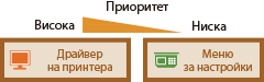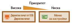 Приоритет на настройкитеНастройките, които са зададени в драйвера за принтер, ще заместят посочените на работния панел. | | Когато извършвате директен печат или директен печат от USB, настройките, зададени за печат или съхранени в TIFF данни, заместват посочените на работния панел. | |