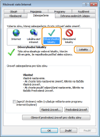 Vyberte položku [Dôveryhodné lokality] na karte [Zabezpečenie] a kliknite na položku [Lokality].