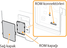 Bu bölüm, Barkod Yazdırma Kiti veya PCL Uluslararası Yazı Tipi Seti öğesinin makineye nasıl takılacağını açıklamaktadır. ROM, makinenin sağ kapağının içindeki ROM konnektörlerine bağlı şekilde kullanılır. ROM'u takmadan önce Kurulum içindeki önlemleri okuyun.