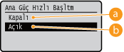 Ağ kullandığınızdaAşağıdaki ayarlardan herhangi biri <Açık> ise, hızlı başlat işlevi devre dışıdır.