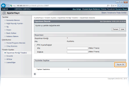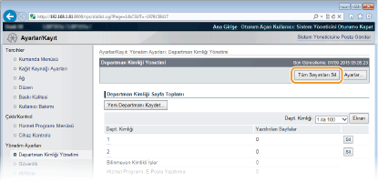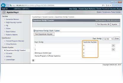 Denetleme sonucunu yazdırmak içinSayfa sayısını sıfıra getirmek içinHer bir departman için sayfa sayısını sıfıra getirmek istediğinizde, [Dept. Kimliği] altındaki metin bağlantısını tıklayın ve [Sayımı Sil]