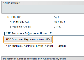 [Ağ] [TCP/IP Ayarları] öğesini ve ardından görünen [SNTP Ayarları] öğesindeki [NTP Sunucusu Bağlantısını Kontrol Et] öğesini tıklatarak kayıtlı sunucudaki iletişim durumunu görüntüleyebilirsiniz. Uygun bir bağlantı kurulduysa, aşağıda gösterildiği gibi sonuç görüntülenir. Bu işlemin, sistem saatini ayarlamadığını unutmayın.