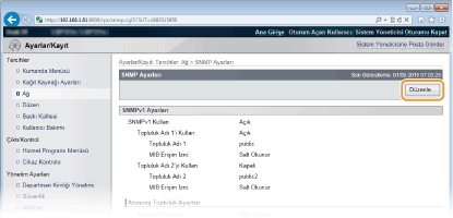Basit Ağ Yönetimi Protokolü (SNMP), Yönetim Bilgi Tabanı (MIB) kullanılarak bir ağdaki iletişim aygıtlarını izleme ve denetleme protokolüdür. Makine, SNMPv1'i ve güvenliği geliştirilmiş SNMPv3'ü destekler. Belgeleri yazdırırken veya Uzak Kullanıcı Arabirimi'ni kullanırken bir bilgisayardan makinenin durumunu denetleyebilirsiniz. SNMPv1 veya SNMPv3'ü ayrı ayrı veya her ikisini de aynı anda etkinleştirebilirsiniz. Her bir sürümün ayarlarını, ağ ortamınıza ve kullanım amacınıza uyacak şekilde belirtin.