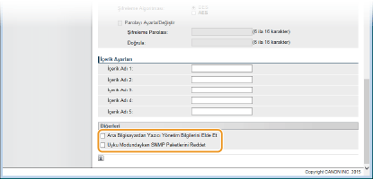 Eğer onay kutusunu seçerseniz, örneğin Canon software imageWARE Serisi gibi SNMP protokolünü kullanan uygulamaların makineye erişimi devre dışı kalabilir.